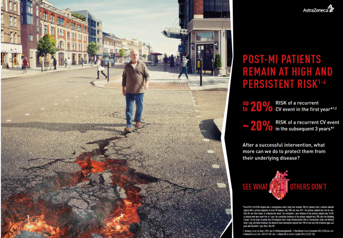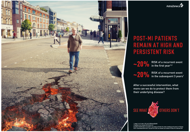This advert is part of a campaign being run by your global medical colleagues called ‘See what others don’t’. Its purpose is to raise awareness among cardiologists of the residual risk of recurrent cardiovascular events in patients who have experienced a myocardial infarction.