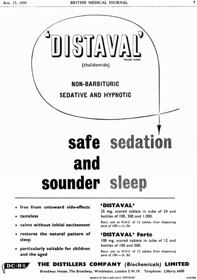 The first paper describing the pharmacological effects of thalidomide was published in 1936. It was the only non-‐barbiturate sedative available at that time. It entered the German market in 1957 as an over-‐the-‐counter sedative that was ‘particularly suitable for infants and the elderly’. It was advertised as ‘safe’ and ‘free from untoward side effects’.