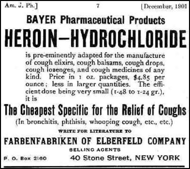 From 1898 through to 1910, diacetylmorphine was marketed by Bayer under the trade-‐name ‘Heroin’ as a non-‐addictive alternative to morphine and cough suppressant. By 1899, Bayer was producing about a ton of heroin a year, and exporting the drug to 23 countries. There were heroin pastilles, heroin cough lozenges, heroin tablets, water-‐soluble heroin salts and a heroin elixir in a glycerine solution.