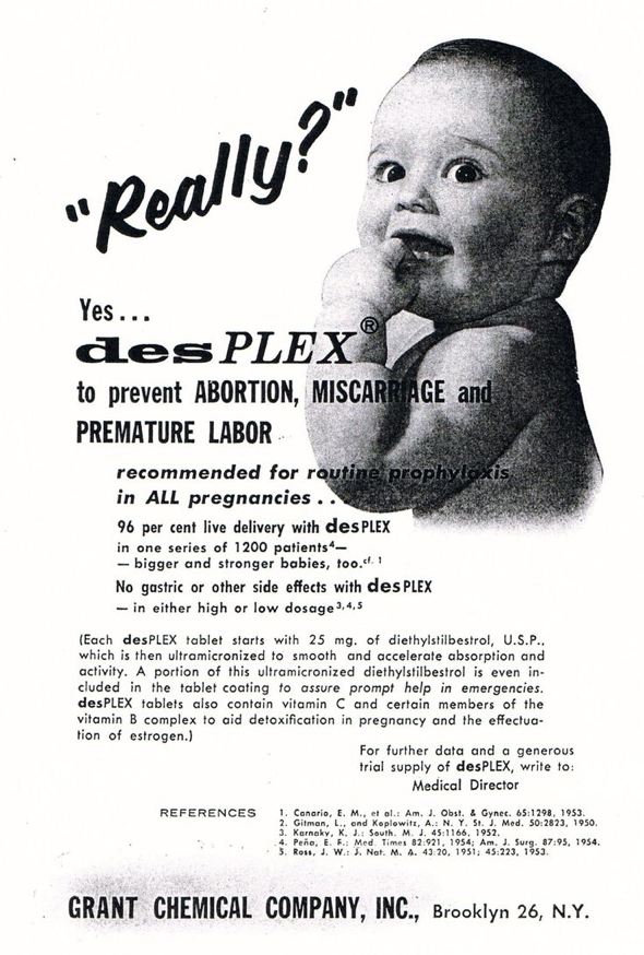 In the 1940s, the synthetic oestrogen, diethylstilbestrol (DES), was advertised around the world to “prevent miscarriages” and in healthy pregnancies “to make babies stronger”. The advert shown here states that it was recommended for routine prophylaxis in ALL pregnancies, and that it had ‘no gastric or other side effects’. Unfortunately women who took it ended up with a higher risk of breast cancer and their daughters, exposed in utero, developed reproductive tract abnormalities and, in some cases, a rare form of vaginal cancer.